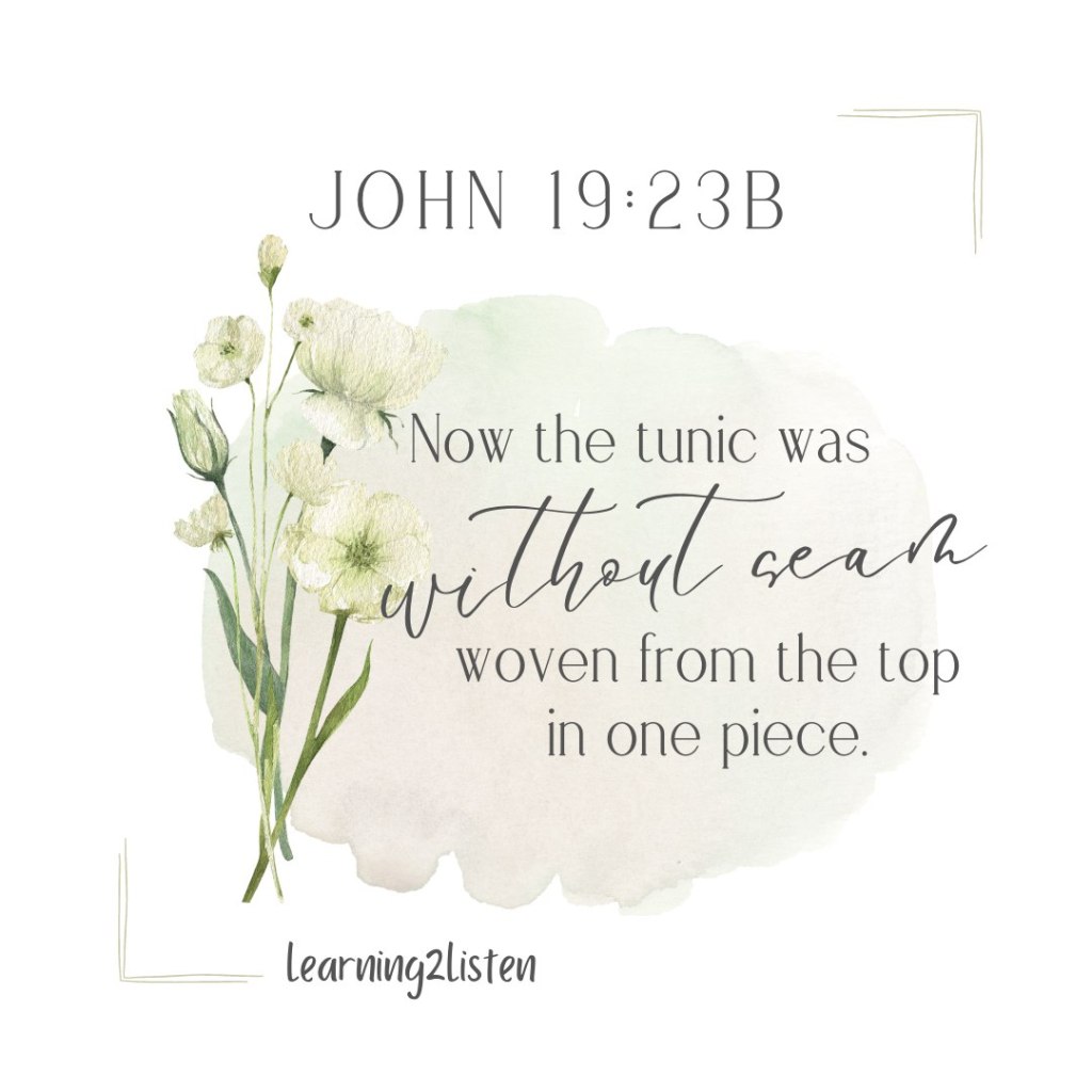 Bible scholars have identified over 100 prophecies that were fulfilled that dark Friday when Jesus hung on Calvary. Imagine that. One hundred prophecies fulfilled at the cross! Our Abba Father wove a thousand thoughts into every little detail of His Masterpiece. Signpost after signpost pointing the way to Jesus, the corridors of history echoing the Messiah. One of those precious prophecies is one that is so easy to miss, why would we think about the clothes Jesus wore? But this one blows me away, itโs the story of a seamless garment, the one our beautiful Saviour wore!