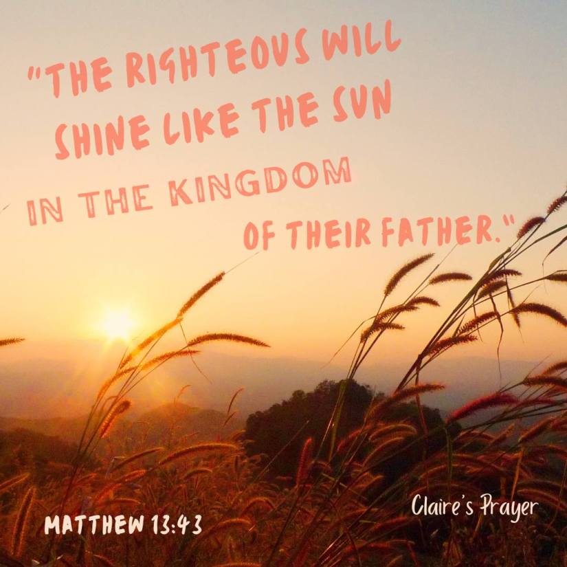The Son of God is so concerned about you and I and those that journey in His Kingdom, ‘𝗡𝗼,’ 𝗵𝗲 𝗿𝗲𝗽𝗹𝗶𝗲𝗱, ‘𝗜 𝗱𝗼𝗻’𝘁 𝘄𝗮𝗻𝘁 𝘁𝗼 𝗹𝗼𝘀𝗲 𝗮𝗻𝘆 𝗼𝗳 𝘁𝗵𝗲 𝘄𝗵𝗲𝗮𝘁 𝗶𝗳 𝘆𝗼𝘂 𝗽𝘂𝗹𝗹 𝘂𝗽 𝘁𝗵𝗲 𝘄𝗲𝗲𝗱𝘀 𝘁𝗼𝗼 𝗲𝗮𝗿𝗹𝘆, 𝗻𝗼𝘁 𝗲𝘃𝗲𝗻 𝗼𝗻𝗲. 𝗜𝘁’𝘀 𝘁𝗼𝗼 𝗱𝗮𝗻𝗴𝗲𝗿𝗼𝘂𝘀.’ (my paraphrase) And so, we grow alongside Wheat’s Evil Twin, in God’s Kingdom, knowing that His care for us is so great. Knowing that He does not want to risk losing even one of us. God’s Kingdom may not be perfect yet, but when it is time for that harvest, all the weeds will be pulled out and “𝑻𝒉𝒆𝒏 𝒕𝒉𝒆 𝒓𝒊𝒈𝒉𝒕𝒆𝒐𝒖𝒔 𝒘𝒊𝒍𝒍 𝒔𝒉𝒊𝒏𝒆 𝒍𝒊𝒌𝒆 𝒕𝒉𝒆 𝒔𝒖𝒏 𝒊𝒏 𝒕𝒉𝒆 𝒌𝒊𝒏𝒈𝒅𝒐𝒎 𝒐𝒇 𝒕𝒉𝒆𝒊𝒓 𝑭𝒂𝒕𝒉𝒆𝒓.” (vs 43)🌾🦋❤